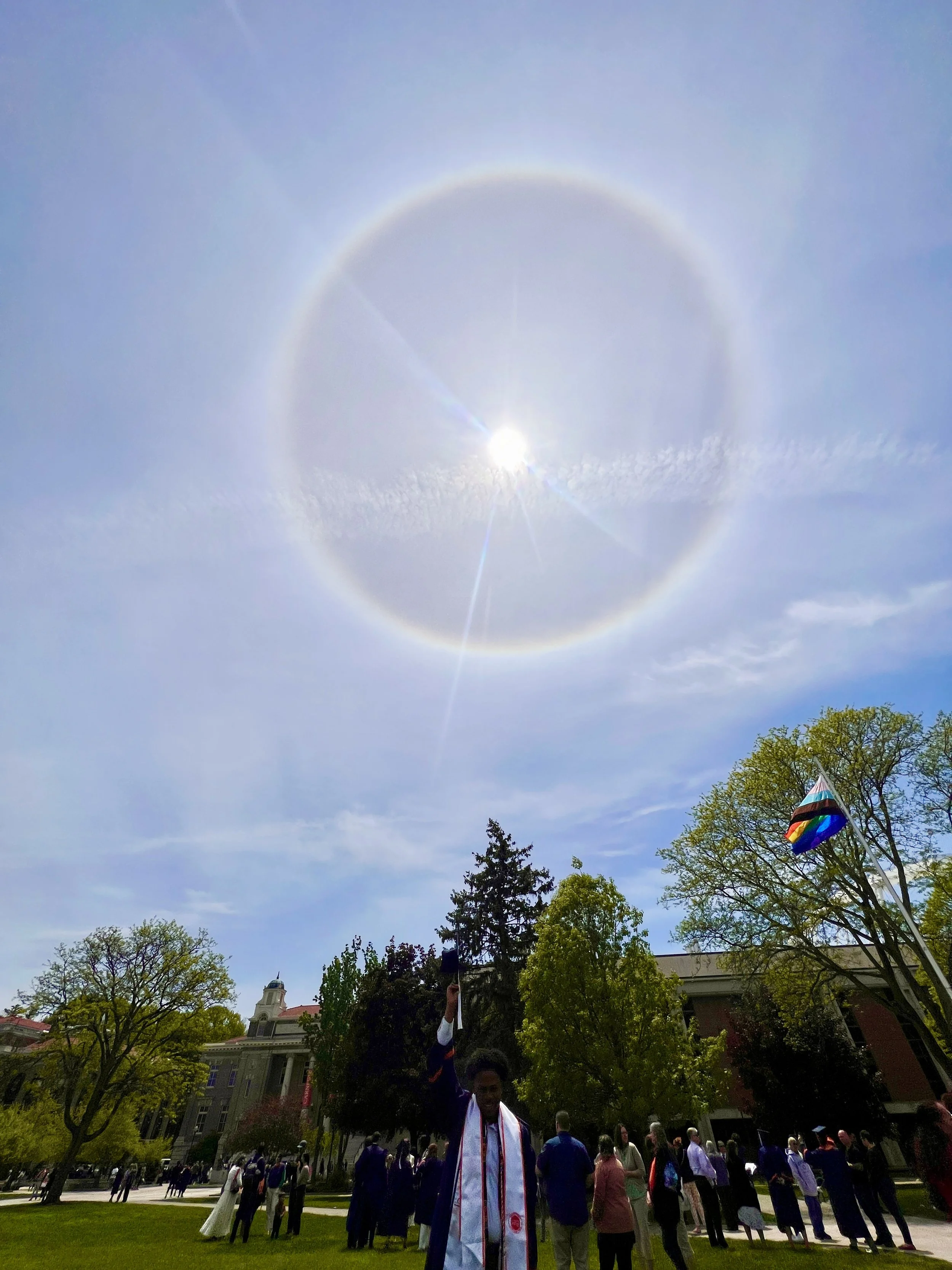 Before, graduation I reread “The Alchemist”. I’d heard rereading it at different points of our lives can provide great insight into our current experiences. What I took away from my second pass at the book was to trust the journey that I’m on. Omens, or signs from the universe will present themselves and it’s up to me fully utilize and accept them. On graduation day a Sun Dog, or Circular Rainbow appeared and blessed the class of 2023. That omen excited me for what lie ahead. I’d never seen one before so to have seen this on graduation day was a blessing.